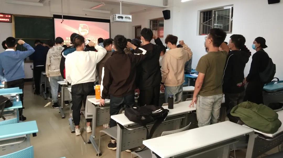 预备党员张瑞康带领大家宣读入团誓词:我志愿加入中国共产主义青年团,坚决拥护中国共产党的领导,遵守团的章程,执行团的决议,履行团员义务,严守团的纪律,勤奋学习,积极工作,吃苦在前,享受在后,为共产主义事业而奋斗。入团誓词的宣读声不仅飘向了窗外,更走进了团支部每位成员的内心,内化为支部成员的思想规范和行为准则。随后,团支部成员一起唱团歌。