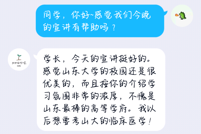 在宣讲结束后,张智棋与部分学弟学妹进行了线上交流,以了解宣讲情况,为后续团队成员的宣讲积累经验。本次宣讲激发了许多学生报考山大的热情,树立了热情友善、学识渊博的山大学子形象,在学弟学妹们的心里留下了山大 “为天下储人才、为国家图富强”的敢为人先、立志报国的优秀形象。