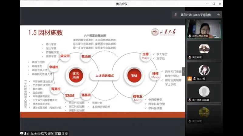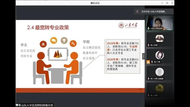 此前,449队已经就活动开展会议,涉及宣讲注意事项、宣讲内容、宣讲后续的答疑等内容。19时,线上宣讲活动开始。岳孜烨代表山大宣讲,她首先进行了简短的自我介绍,随后将雷竞技RAYBET最新版的优势特点、专业设置、招生情况与预想的同学们的疑惑结合起来。同学们提出了“如何看待自己现在的分数和排名,能触摸到山大的排名是多少”、“在高考后进行专业选择时要考虑什么”、“在山大能得到什么层次的栽培和资源”、“在山大,真实的大学生活是怎样的”等问题,岳孜烨结合自己的亲身经历和感受,对这些问题一一作了回答。考虑到相当一部分高中生存在对大学过分的幻想、对专业的不认识,对高校和个人发展的不理解等问题,所以岳孜烨把这几个方面作为宣讲的重点,旨在帮助他们解决实际的困惑和难题。