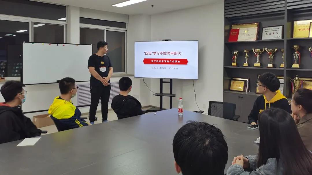 晚上八点三十分,活动准时开始,首先由来自土木二班党小组的张瑞康同志分享了四史的基本内容以及应该如何学习四史。张瑞康认为,学习四史首先要形成历史认知,明确历史不是分离的个体,而是相互贯通和影响的,并以苏联为何会由盛转衰最终解体为例强调大家在学习历史的同时应该汲取其中的经验,紧跟时代潮流,要树立良好的历史观念,牢记使命才能学好历史,充分运用历史留下来的宝贵财富。