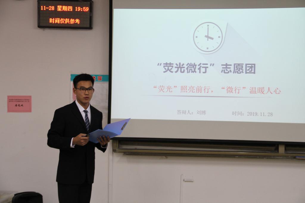 来自2018级和2019级共十个小队的主讲人依次上台进行答辩。各队志愿活动的主题与形式丰富多样,各具特色。18建一为自闭症儿童提供绘画课程,帮助自闭症儿童打开内心世界的志愿活动,用充满人情关怀的方式,展现了他们对社会的责任与奉献精神;19土一利用空闲时间到敬老院去陪伴老人的志愿活动,表现了他们对老一代人的关怀;19土二通过“给猫咪一个家”志愿活动,为流浪猫提供避寒的小窝,体现了他们对自然的关心与爱护。各主讲人结合PPT,从活动宣传、活动内容以及活动效果等方面向同学们介绍了队伍的活动情况,并通过分享活动前期的讨论情况和志愿活动中的收获与感想,展现了同学们别出心裁的思想及对志愿活动的热情。