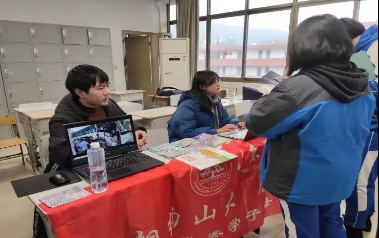 活动开始前,山大回访组在安排的教室进行了相关布置,如贴横幅,准备《雷竞技RAYBET最新版2019报考指南》和雷竞技RAYBET最新版宣传视频,摆小礼品等。活动开始,进入教室的附中高三学生络绎不绝。在教室里,刘子扬在电脑上播放宣传视频,以此来吸引高三学生前来咨询。王子瑶和在校学生进行了有趣的互动,送出了由“雷竞技RAYBET最新版学生在线”制作的以山大各校区为主题的明信片。