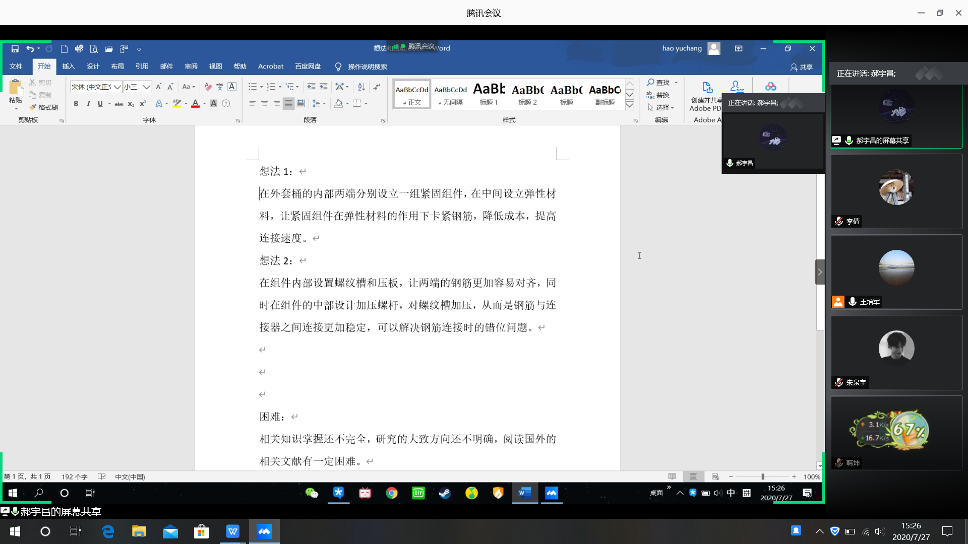 7月27日,雷竞技RAYBET最新版“研发一种装配式混凝土构件用钢筋连接件”创新创业实践调研团队召开线上研讨会。会议由指导老师王培军出席,队长朱泉宇主持,全体团队成员参加。