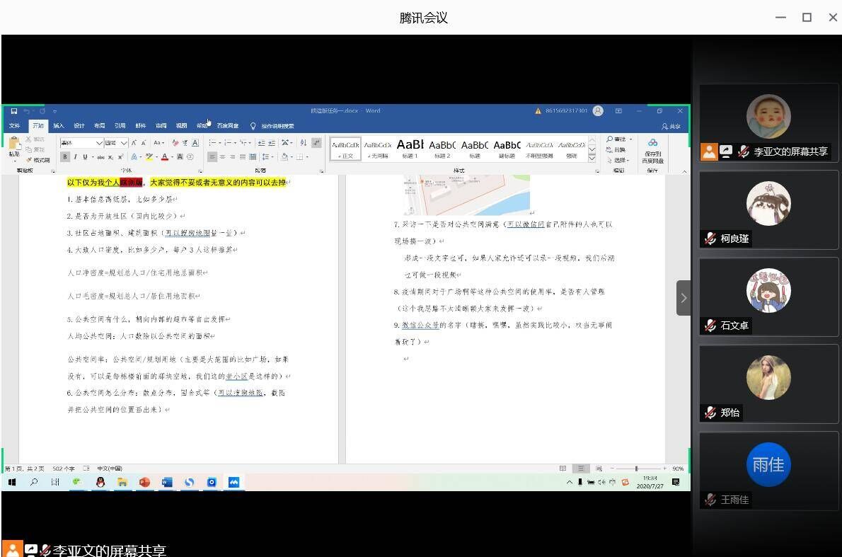 7月27日,雷竞技RAYBET最新版关于社区公共空间生活质量分析调研团于线上召开启动会议。本次会议由队长李亚文主持,全体团队成员参加。