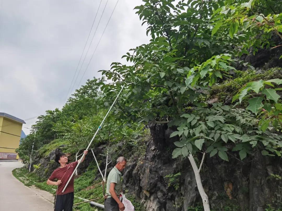 上午八点,队员们在安兰村护林员队长袁家敏的带领下参观了安兰村核桃示范片,安兰村核桃树现有成活12191株,广泛分布于全村25个队,其中示范片位于龙汉队和力米队。袁家敏给队员们介绍了核桃树种植培育的注意事项与核桃产业情况。目前安兰村核桃树种植处于发展阶段,核桃树种植数目多但结果数量较少,需要护林员和农户投入更多的精力去修护培养,尚未能给农户带来稳定的经济效应。核桃树需要农户定期进行修剪、施肥,还要在季节变化时给核桃树涂白,防治天蛾虫、天牛虫、蛀虫等害虫影响。袁庭蔚参与到了核桃树的修剪,施肥与涂白工作中,并运用所学的边坡工程知识维修稳固核桃林田土,减少暴雨山间的水土流失。实践团队参与完成了十亩120株核桃树的修剪与涂白工作,队员在实际的劳动中体会护林员与农户的工作,在劳动锻炼中促进了个人的发展。