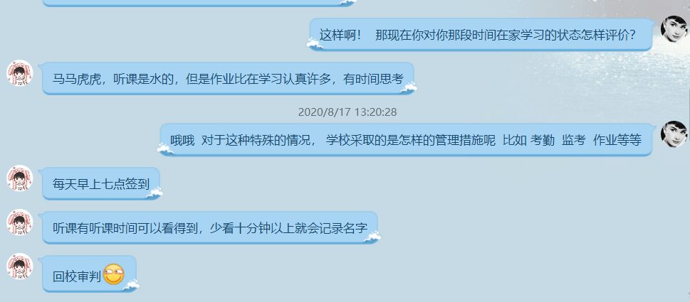 随后,张政又陆续采访了五位同学,发现大部分同学都认为线上学习的效果不如线下学习。调研组后续讨论分析认为,线上学习更适合成绩好、学习自主的同学,而大部分的普通学生则是更适合线下学习。在问及学校如何进行线上监督学习时发现,当地学校对于线上学习的监督做得很到位。每天早上七点即进行签到,上课时要开启摄像头,便于老师管理,上课软件后台也会有听课记录,少看10分钟就会记上姓名,学校要对被记名同学进行检查等。调查组总结,线上学习的监督问题不大,学生在家能否自觉学习才是影响成绩的主要原因。同时,通过受访学生的经验分享得知,线上的按时预习,及时复习更为重要,利用线上授课可以回放的优点还可以帮助同学们及时查漏补缺。